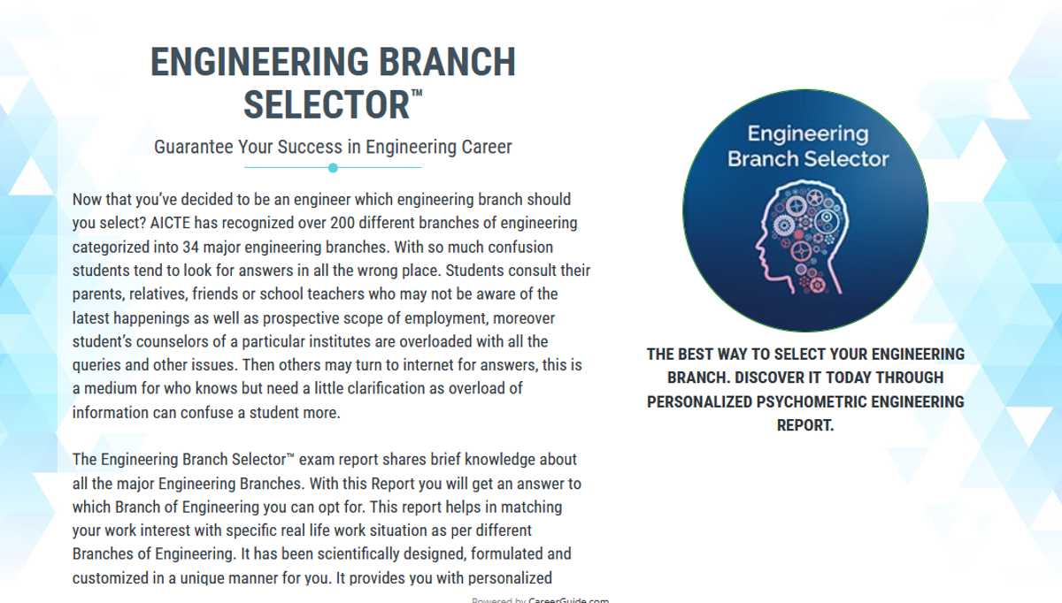 Guarantee Your Success in Engineering Career - THE BEST WAY TO SELECT YOUR ENGINEERING BRANCH. DISCOVER IT TODAY THROUGH PERSONALIZED PSYCHOMETRIC ENGINEERING REPORT.